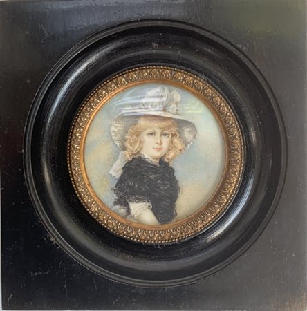 Firma indecifrata "Ritratto di fanciulla con cappello" miniatura tonda (d. cm 7) Firmata a destra. In cornice