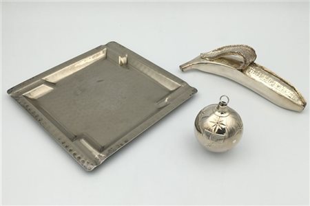 Lotto composto da una banana e una palla natalizia in argento (gr 170 ca) uniti ad un posacenere in metallo argentato (lievi difetti)