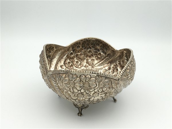 Centrotavola di forma mossa in argento sbalzato a fiori e foglie, piedi decorat