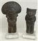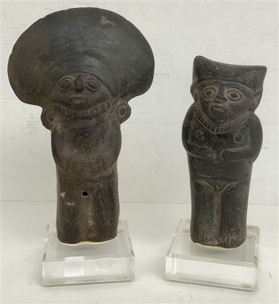 Arte peruviana, lotto di due sculture rituali a figure femminili in terracotta (h cm 15 e 20) su base in plexiglass (difetti e restauri)