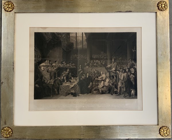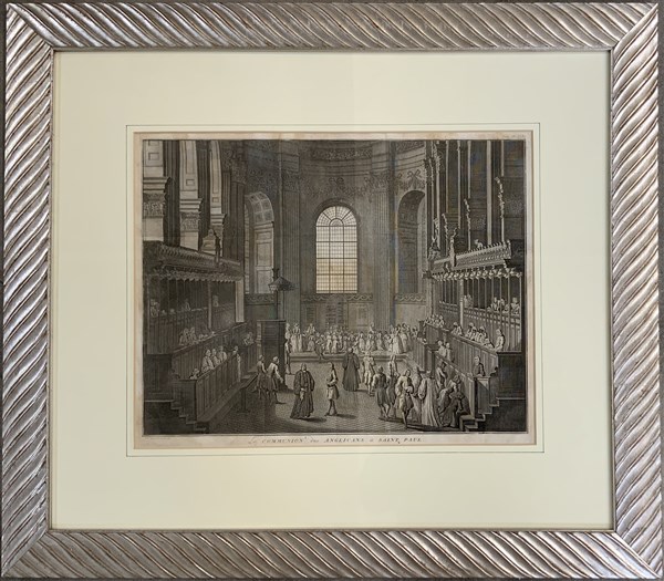 Lotto di due incisioni di epoche diverse, raffiguranti "La communion des anglicans a Saint Paul" (cm 41x33) e "The trial of William Lord Russell" (cm 58x42), in cornici(difetti)