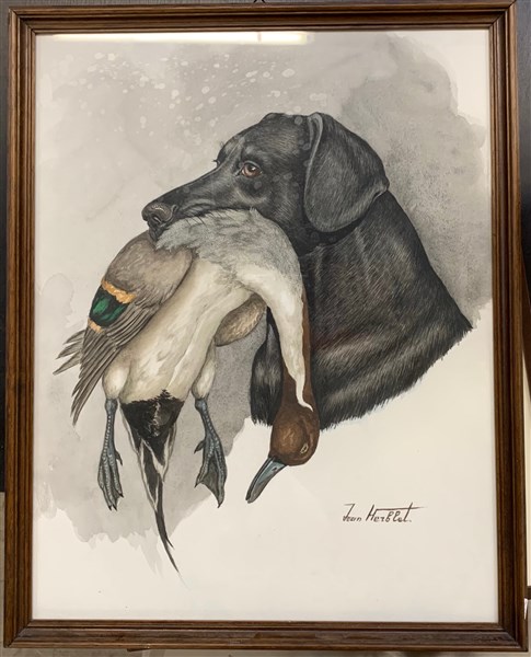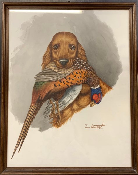 Jean Herblet Coppia di acquerelli raffiguranti "Cani con selvaggina" (cm 36x46)
