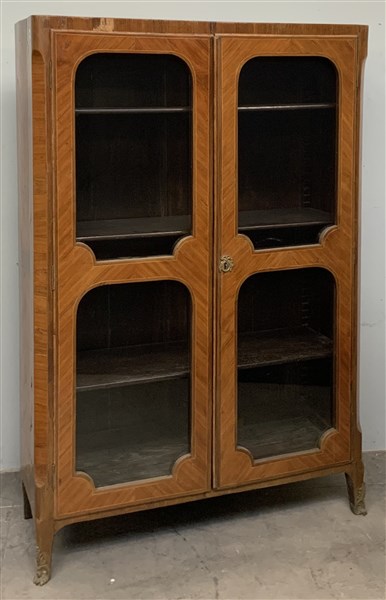 Mobile vetrina a due ante lastronate e filettate in legni vari, piedi mossi muniti di scarpette. Francia secolo XIX (cm 108x162x37) (difetti)