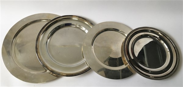 Lotto composto da quattro piatti tondi in argento di diversa epoca e decoro (g 3200)