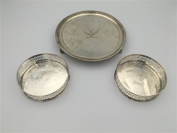 Lotto composto da un salver inglese e due sottobottiglia con bordi traforati, epoche diverse (g 900)