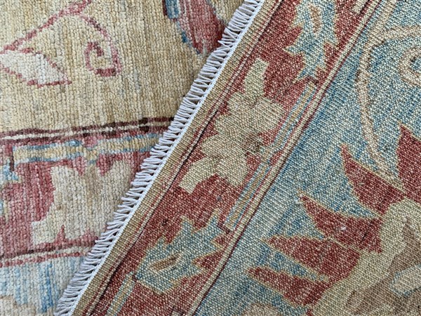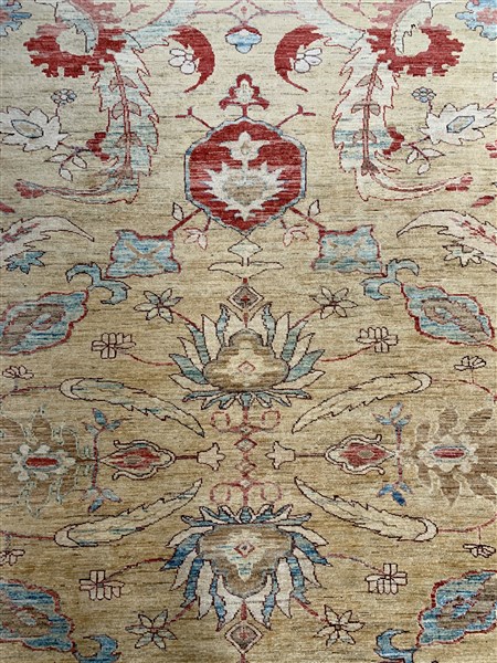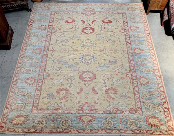 Tappeto Azeri, Caucaso. Secolo XX. Decoro floreale sparso in stile Serapi su fondo camoscio, bordure a fondo azzurro (Lievi difetti) (cm 367x270)
