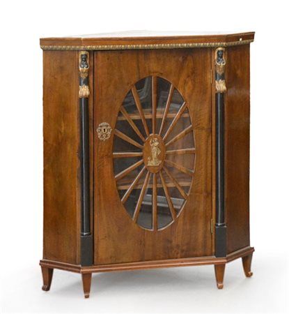 Angoliera lastronata in noce con profili dorati, montanti ebanizzai e intagliati a motivi femminili. Anta decorata da fregio a figura femminile. Secolo XIX (106x120x71) (difetti)