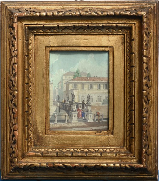 Ignoto del XIX Secolo "Il Ponte delle Sirenette sul Naviglio di San Damiano" tempera su pergamena applicata a cartone (cm 15.5x12) Reca iscrizione A. Inganni in basso a destra.