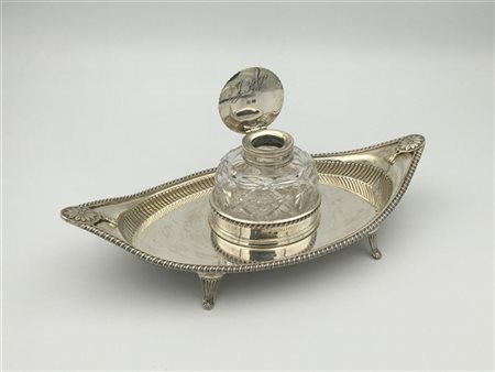 Calamaio a "barchetta" in argento con bordura cordonata cesellata a fiori, porta inchiostro in vetro. Marchi di Sheffield, 1900. Argentiere T.B & S (g netti 500)