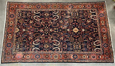 Tappeto Mahal Zigler, Persia, inizio Secolo XX. Decoro all over floreale policromo su fondo blu notte. (Difetti, rapature, vecchi restauri) (cm 476x330)