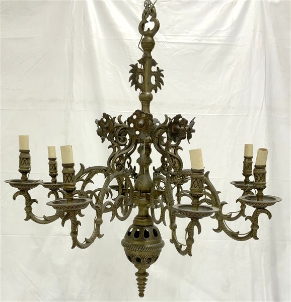 Lampadario in bronzo a otto luci con bracci a volute e fiori stilizzati, Olanda secolo XIX (d cm 75) (difetti)