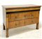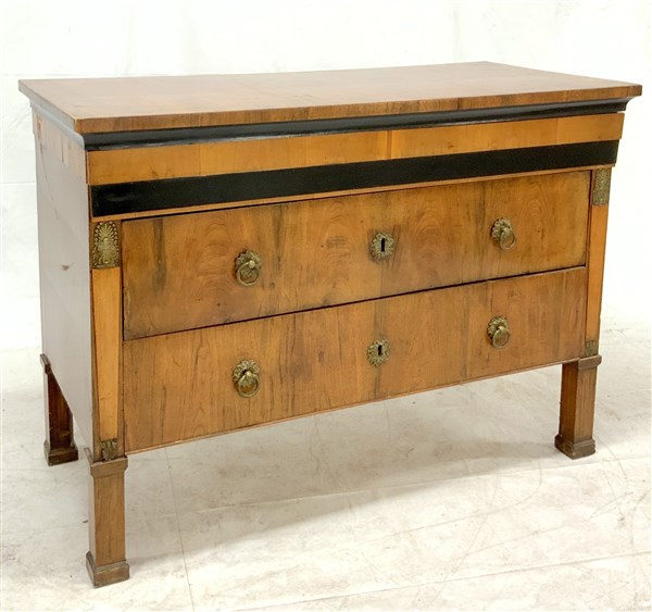 Comò lastronato in legni vari, fasce ebanizzate. Montanti a lesene, piedi a plinto. Secolo XIX (cm 132x95x62) (difetti)