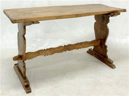 Tavolo fratino in legno, montanti scolpiti ad asso di coppe uniti da traversa.