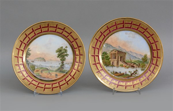 Manifattura del secolo XIX, coppia di piatti in porcellana decorati nel cavetto in policromia con "Veduta di Bagnoli" e "Tempio e fiume di Clitumno" e sul bordo a motivi geometrici in oro, titolati al retro (d cm 22) (difetti)