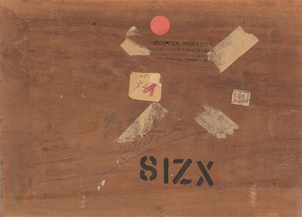 "Marina con pescatori" olio su tavola (cm 22.5x30) Firmato in basso a sinistra. Al retro: timbro della Mostra Postuma Agostino Fossati, 1932. (difetti)