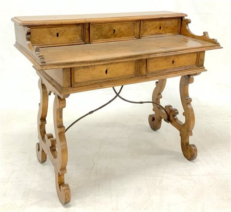 Scrivania lastronata in noce. Alzata a tre tiretti, due cassetti nella fascia, gambe a lira riunite da traversa in ferro. Secolo XVII (cm 112x94x57) (restauri)