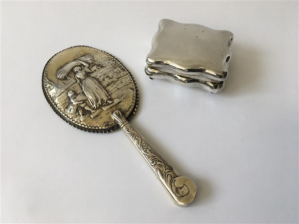 Lotto composto da un porta specchio in argento sbalzato a scena contadina, punzoni inglesi di Londra, Argentiere "JSB" unito ad un cofanetto di forma mossa in argento titolo 800 (g lordi 390)