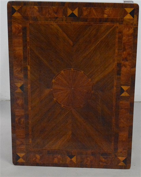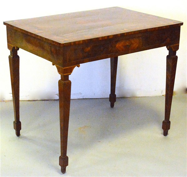 Tavolo da centro lastronato in legni vari e filettato con due cassetti nella fascia e gambe rastremate. Fine secolo XVIII (cm 93x78x67)(difetti e restauri)