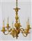 Lampadario in bronzo dorato a sei luci con braccia decorate a volute fogliate a