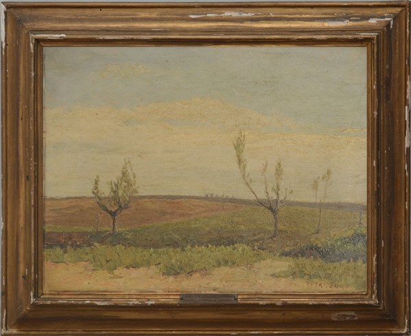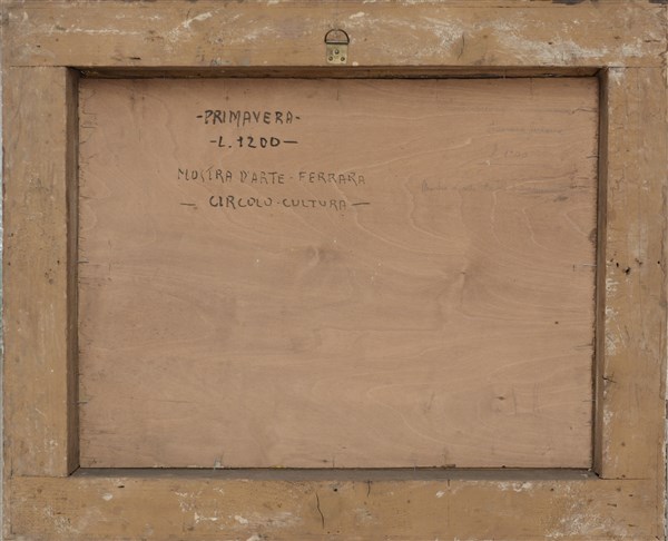 "Primavera, pianura ferrarese" olio su compensato (cm 46x60) Firmato in basso a destra. Al retro: titolato ed iscritto. In cornice antica a cassetta (difetti)