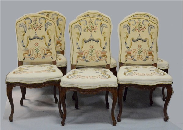 Gruppo di sei sedie con gambe mosse in legno intagliato, sedute e spalliere rivestite in tessuto bianco con ricami floreali, secolo XVIII (difetti)