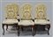 Gruppo di sei sedie con gambe mosse in legno intagliato, sedute e spalliere riv