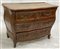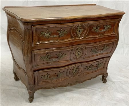 Comò provenzale di forma mossa a tre cassetti con profili intagliati, piedi a ricciolo e maniglie in bronzo. Secolo XVIII (cm 125x90x62) (difetti e restauri)