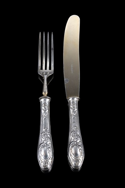 Parte di servizio in argento e metallo argentato con presa sbalzata e cesellata a volute fogliate composto da: sei forchette, sei coltelli e sei coltelli da burro e sei forchettine. Titolo 800 (difetti) (lievi differenze)