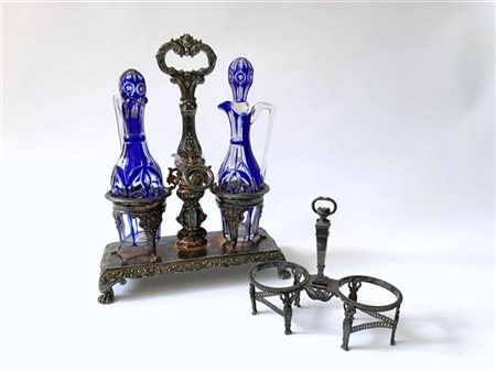 Lotto composto da due porta oliere in argento,di cui una con punzoni di Milano del secolo XIX e una con punzoni francesi del secolo XIX (g. 350 ca.)una con ampolle in cristallo(difetti)