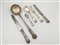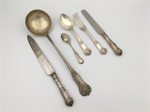 Servizio di posate in argento composto da: diociotto forchette, diciotto coltelli, diciotto cucchiai, diciotto cucchiaini e due posate da portata, cifrate (gr 4770 ca) (difetti)