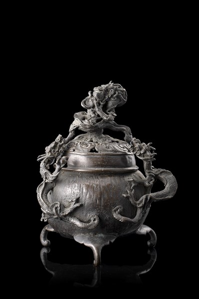 Incensiere tripode in bronzo, anse con draghi, coperchio traforato (lievi difetti)