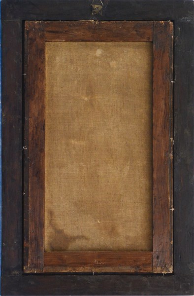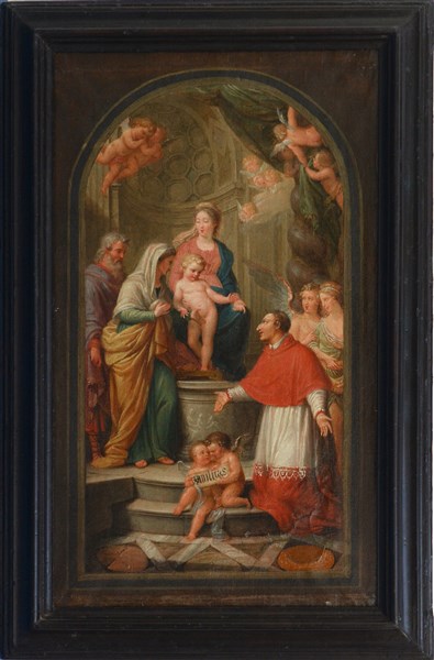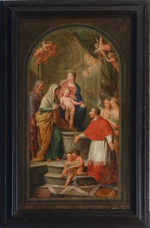 Scuola della fine del secolo XVII - inizio XVIII "Madonna con Bambino, San Giuseppe, Sant'Anna e San Carlo Borromeo" olio su carta applicata su tela (cm 58x34). In cornice