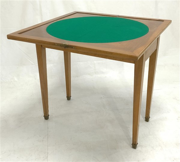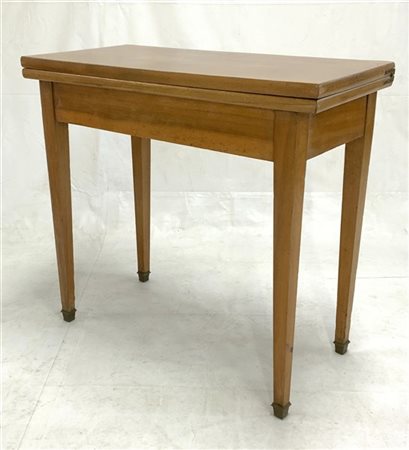 Tavolo da gioco di forma rettangolare con piano apribile e girevole. Gambe rastermate terminante con scarpette in ottone. Secolo XIX (cm 82x76x40)