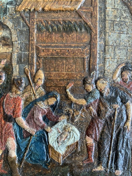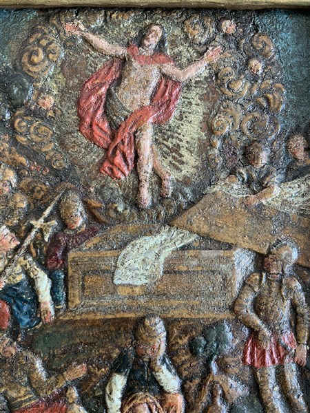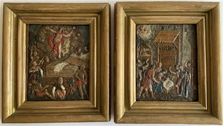 Arte popolare del secolo XIX "Natività" e "Resurrezione" coppia di bassorilievi