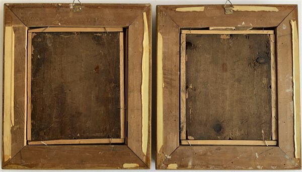 Arte popolare del secolo XIX "Natività" e "Resurrezione" coppia di bassorilievi in papier-mâché dipinta (cm 20x16). In cornici