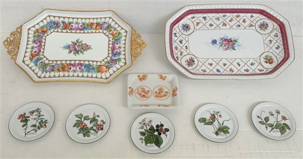 Lotto composto da una coppia di vassoi in ceramica con decori floreali marcati Limoges, cinque piattini con decoro floreale di manifattura bavarese e uno svuotatasche raffigurante galli, marcato Ginori (lievi difetti)