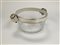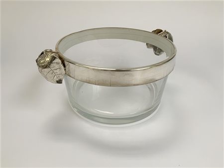 Fruttiera in vetro e metallo argentato con manici a foggia di frutto e foglia di fragola. Secolo XX. (h cm 13,5; d cm 25) (difetti)