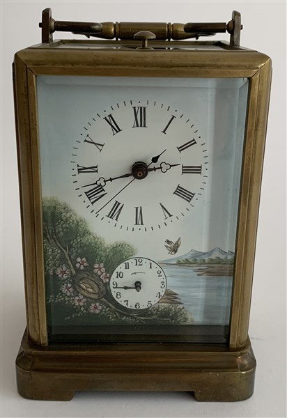 Mostra dipinta composta da due quadranti di cui uno per le ore a cifre romane con lancetta dei secondi centrale ed uno per la sveglia a cifre arabe.