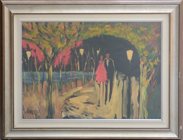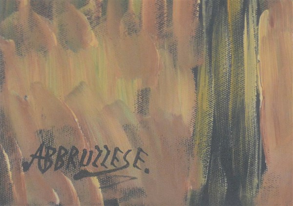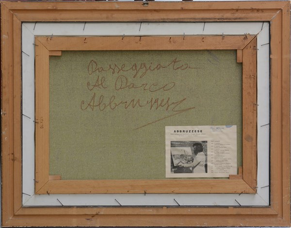 Abbruzzese, "Passeggiata al parco", olio su tela (cm 50x70), firmato in basso a sinistra; titolato e firmato al retro. In cornice
