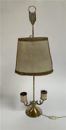 Lampada da tavolo a una luce in metallo argentato con due portabicchieri e paralume in tessuto e pergamena. Secolo XX. Recante firma indecifrata alla base. (h cm 89) (difetti, piccole rotture e mancanza)