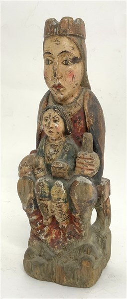 Scultura in legno laccato raffigurante Madonna in trono con Bambino (h. cm 33) (difetti e mancanze)