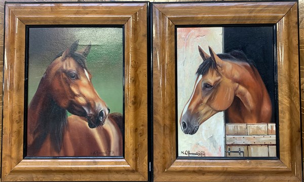 Coppia di dipinti ad olio su tela raffiguranti "Teste di cavallo da corsa" (cm 24x18) firmati in basso, in cornici