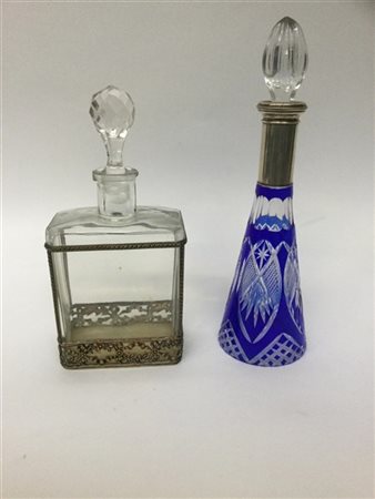 Lotto composto da due bottiglie porta liquore con tappo, una di Boemia con ghiera in argento, l'altra con decoro in metallo argentato a fiori e nastri, misure diverse (difetti)