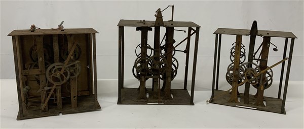 Due cartoni contenenti tre meccanismi di orologi morbier (difetti e mancanze)