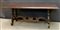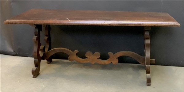 Tavolo fratino da salotto con gambe a lira riunite da traversa. (cm 140x54x55) (difetti)