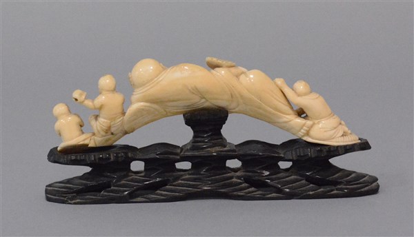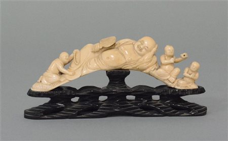 Gruppo in avorio raffigurante Buddha con accoliti, base in legno (difetti)