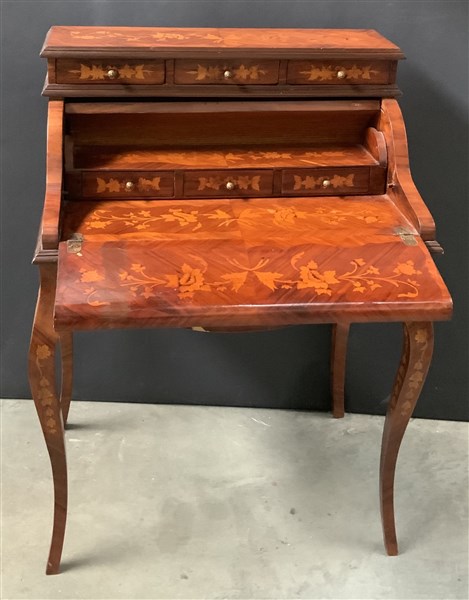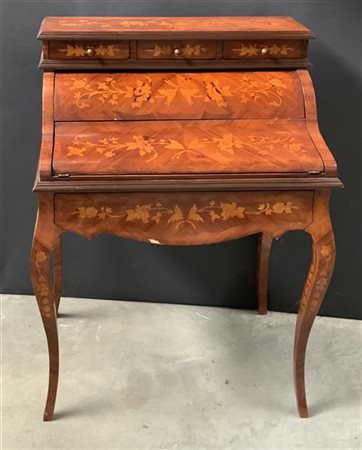 Scrittoietto lastronatoe intarsiato in legni vari, parte superiore a tre cassettini, parte centrale con anta ribaltabile celante cassettini, fascia da un cassetto e gambe mosse. (cm 78x106x50) (difetti)