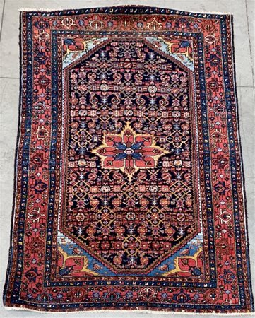 Tappeto Ferahkan, Persia, secolo XX. Decoro con piccolo medaglione stellato nei toni del giallo, rosa e azzurro su campo decorato con motivo Herati su fondo blu notte (cm 200x135) (Lievi difetti)