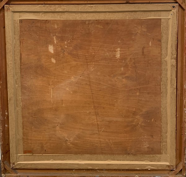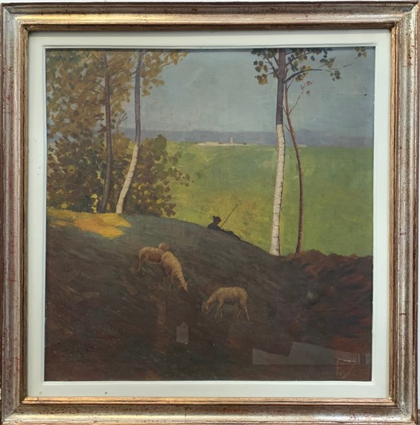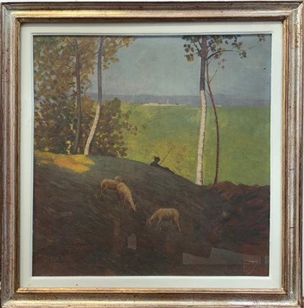 Firma indecifrata "Paesaggio con pecore" olio su compensato (cm 64x64) siglato F.S. in basso a destra, in cornice
