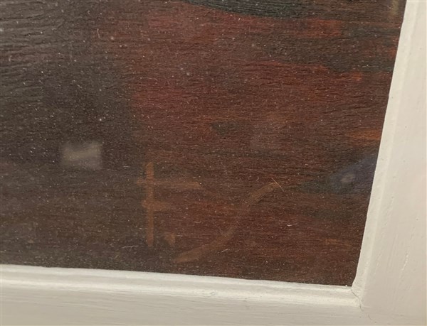 Firma indecifrata "Paesaggio con pecore" olio su compensato (cm 64x64) siglato